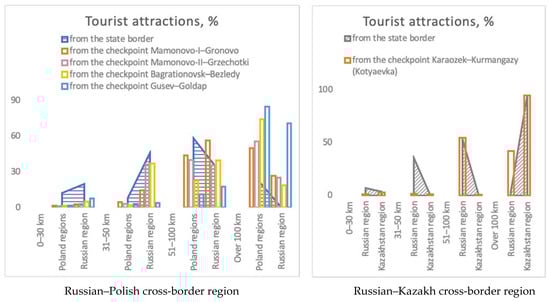 Distribution of tourist attractions in the Russian–Polish and Russian–Kazakh cross-border regions by territorial zones in relation to their distance from the border and automobile checkpoints, 2021. Source: OpenStreetMap database (https://www.openstreetmap.org; last accessed on 2 January 2022).