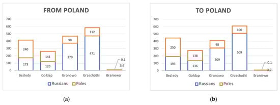Cross-border movement at the Russian–Polish border by checkpoints in 2019, thousand people. (a) From Poland (b) To Poland.