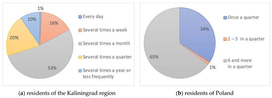 The cross-border region on the border of Russia and Kazakhstan includes the Russian Astrakhan region and Kazakhstan’s Atyrau region. In addition to the Kaliningrad region (an exclave region of Russia) and the bordering region of Warmia and Mazury, the Pomorskie Voivodeship is additionally included in the Russian–Polish cross-border tourist region, which does not have a land border with Russia, but it locates the Tricity agglomeration of Gdansk–Sopot–Gdynia with developed tourist infrastructure, services, and retail trade. The expansion of the geography of the study by the inclusion of the Pomeranian Voivodeship is explained by its high tourist attractiveness for residents of the Kaliningrad region, with relative proximity to the Russian–Polish border. Kaliningraders have the opportunity to make a one-day tour to the Polish city of Gdansk with a departure in the morning and return in the evening of the same day, which makes this destination attractive for relaxing on weekends or holidays.