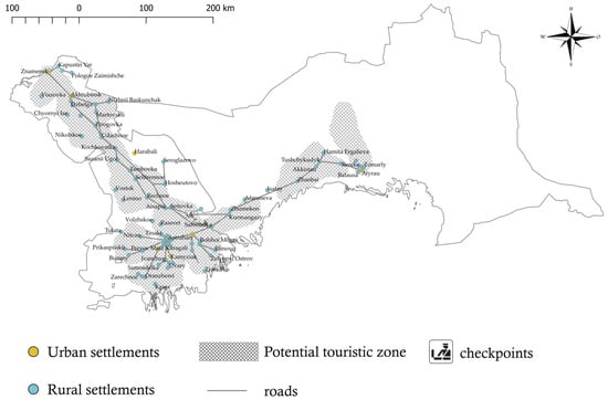Typically, cities are the main attractions for tourists featuring touristic sights, hotels, restaurants, and other infrastructure facilities. In the case of cross-border tourism, especially when tourists travel by car, this might be a good opportunity for rural settlements to receive economic benefits from their location along the path of tourist movement and, in the future, become an independent tourist destination. Recent studies on cross-border tourism question the conventional principles of outlining tourism destinations limited to administrative boundaries, advocating for using a wider approach based on the actual tourists’ consumption patterns [21,22,23,24]. This implies incorporating tourist destinations on both sides of the border being part of a single tourist route.