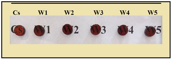 In this work, SLS glass waste was used as an alternative source of silicon SiO by crushing it into powder using a mortar and pestle. Chemical powders such as BiO, ZnO, BO, and WO were used to prepare glass samples with composition (WO)[(BiO) (ZnO) (BO) (SLS)], where x = (0, 0.01, 0.02, 0.03, 0.04 and 0.05 mol). The melt-quenching method was utilized to fabricate the glass samples. The chemical powders were blended, thoroughly crushed for 10 min in a mortar and pestle, and transported to an alumina crucible. After that, the crucible was placed in the electric furnace where the temperature of the furnace progressively rose to 1200 °C at a rate of 10 °C/min and was held for 1.5 h for melting. After that, the molten mixture was poured into a preheated cylinder brass plate and annealed for about 1 hour at approximately 350 °C in order to avoid strains and internal mechanical stress. Lastly, samples were polished to evaluate the characteristics of the glass after cooling to room temperature. These glass types have a thickness of 6 mm, and were labeled CS, W1, W2, W3, W4, and W5, which correspond to doping levels of 0, 0.01, 0.02, 0.03, 0.04 and 0.05 mol WO, respectively (as shown in Figure 1).