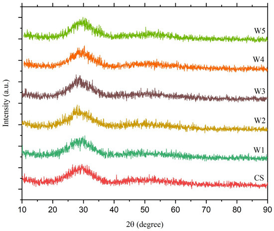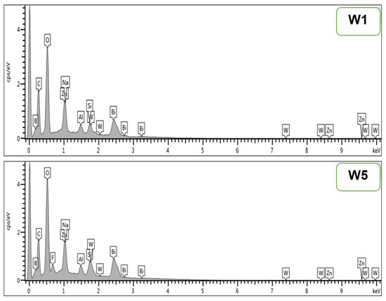 X-ray fluorescence (XRF) is an effective analytical method for characterizing SLS glass. The chemical compositions of SLS glass samples were determined through XRF analysis and are summarized in Table 2. Elements such as SiO, NaO, CaO, and other minor elements were discovered in the sample. The nature of the WBiZnB-SLS glass samples was determined using their XRD spectra, as seen in Figure 4. All samples had an obvious wide hump and lacked distinct peaks. This demonstrated that all samples were amorphous in nature [40]. EDX analysis results of the WBiZnB-SLS glass samples indicated the existence of tungsten, bismuth, oxygen, zinc, silicon, and boron components, which are shown in Figure 5.