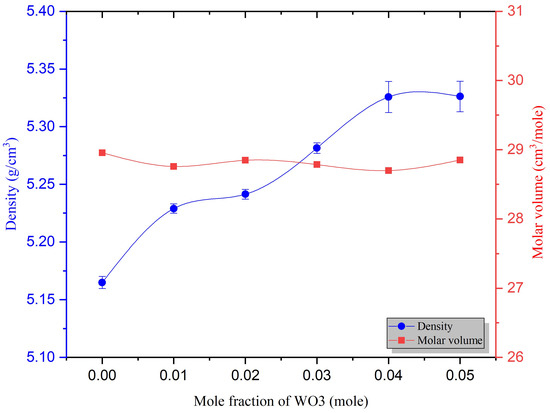 The influence of WO on the physical features was evaluated in the present study. Table 3 shows the various physical parameters of the glass samples. Differences in and with WO concentration are illustrated in Figure 6, which shows that the of the glass samples rose gradually from 5.16 to 5.31 g/cm with the increase in WO content in the glass network. The molar volume also clearly remained approximately constant with increasing WO content. These results can be explained by the dopant of WO (with a molecular weight of 231.84 gmol) in BiO-ZnO-BO-SlS glass (with a molecular weight of 149.66 gmol). The molar volume was nearly constant. This can be explained by the atomic radius of the W ion (139 pm), which is lower than that of Bi ion (156 pm). WO creates a glass structure that is more compact [41,42,43].