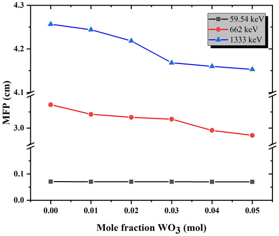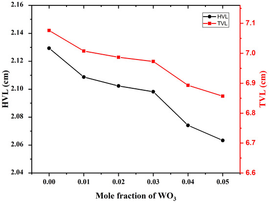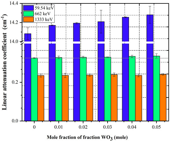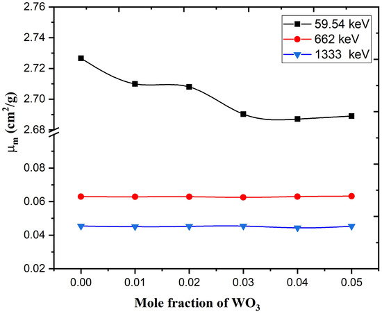 Table 4 and Figure 7 and Figure 8 show that and values were reduced as gamma-ray energy increased. and sharply decreased as gamma-ray energy increased in the low energy range, as the photoelectric effect was responsible for the prominent response between the tested glass samples and gamma rays. The linear and mass attenuation coefficients decreased slightly with increasing gamma-ray energy. This phenomenon can be attributed to the Compton scattering effect. Furthermore, linear values increased with increasing WO content in the glass network. This was due to the increasing glass sample density from 5.16 to 5.31 g/cm, and was proportional to the medium density [45,46]. values declined as the WO content increased, which might be related to the weight fraction of the higher atomic number component (BiO) being reduced at the expense of WO [16].
