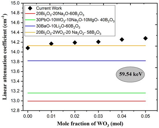 The authors selected various compositions of glass containing heavy metals from previous work, such as 20 BiO-20 NaO-60 BO [47], 30 PbO-10 WO-10 NaO-10 MgO-40 BO, [48], 30 BaO-10 Li-60 BO [49], and 20 BiO-2 WO-20 NO-58 BO glass [50]. The at 59.54 keV was estimated using the Phy-X/PSD software in order to compare the of the present glass to that of other glass samples, as seen in Figure 9. The results indicated that the values in the current work were higher than the values in the previously mentioned studies at an energy of 59.54 keV, and the value of the first glass sample that did not contain WO was less than that of the 20 BiO-2 WO-20 NO-58 BO glass.