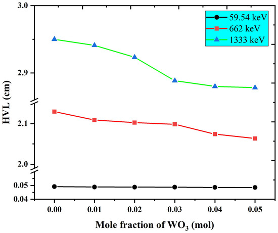 HVL of WBiZnB-SLS glass against WO content.