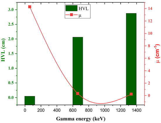 The experimental linear attenuation coefficients for WBiZnB-SLS samples were measured via X-ray fluorescence equipment XRF at photon energies ranging from 16.61 to 25.27 keV, as well as narrow-beam geometry at photon energies ranging from 59.54, 662, and 1333 keV. The and values are summarized in Table 4. XRF results indicate that the prepared glass samples prevented all photons from reaching the detector. In other words, the glass samples absorbed all photons when the photon energy was less than 25.27 keV.