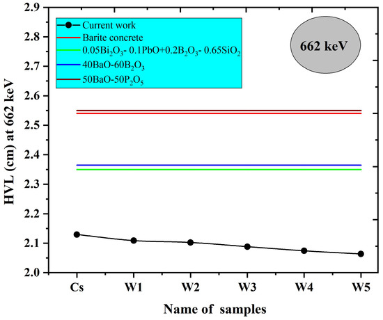 Moreover, HVL values in the present study were compared with HVL of barite concrete and other glass types at 662 keV. Results indicate that HVL values were smaller than the HVL of barite concrete and other glass types. The HVL values for radiation shielding concrete and glass were previously published [49,51,52,53]. The lower the HVL, TVL, and MFP values of the material were, the more effective the shielding characteristics. This indicates that WBiZnB-SLS glass has better shielding properties and can be used as radiation shielding (see Figure 14).