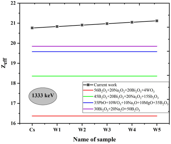 Gamma radiation interactions, such as scattering and absorption, are related to the materials’ effective atomic number. As shown in Table 5 and Figure 15, the concentration increased as the WO content increased for all the samples. The atomic number dependency reveals that materials with a high value attenuate strongly with incoming photons. Moreover, the result indicated a reduction in as the photon energy increased. At low energies, photoelectric absorption dominated, resulting in a large value. The values in the current study were compared to other glass samples at 1333 keV that had been published, as seen in Figure 16 [47,48,50,54]. Research results showed the larger value of to be more efficient and useful in shielding radiation, as the probability of photon interaction increases with increasing concentration, contributing to decreased radiation transmission. Lastly, the effective electron number of the glass samples was calculated and is given in Table 5 at 59.54, 662, and 1333 keV. was nearly constant within the range of 2.89–9.07 electrons/g and reduced as photon energy increased [55].