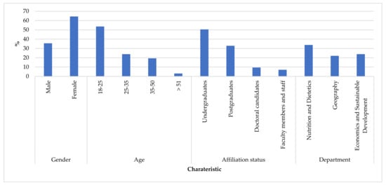 The first section provides information on the demographic profile of the respondents relating to gender, age, affiliation status, and affiliated department (Figure 1). From a gender perspective, 64.4% of the 222 respondents are women. Concerning their age, the majority of the respondents (53.6%) are between the ages of 18 and 25; 23.9% are between the ages of 25 and 35, 19.4% are between 35 and 50, and only 3.1% are beyond 51. In terms of affiliation status, 50.5% of the affiliated groups are undergraduates, 32.9% are postgraduate students (MSc), and 9.5% are doctoral candidates (PhD), while only 7.1% are faculty members. Department-wise, 33.8% are affiliated with the department of Nutrition and Dietetics, 22.1% with department of Geography, and 23.9% with the Department of Economics and Sustainable Development.