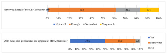 This study attempts to assess the level of awareness of OSH issues among students, faculty members, and staff of HUA. HUA is a state university dedicated to promoting research and learning in a small, well-focused set of intellectual areas, namely economics, sustainable development, geography, nutritional sciences, and information technology. The university, situated in Kallithea, originates from an educational institution that was first established in 1929 by the benefactor Panagis Harokopos. The University’s campus facilities include all four academic departments, the central administration, the library, the information technology centre, and the administrative services. The 3D university campus map can be found here: https://www.hua.gr/media/hua3d/ (accessed on 16 December 2021).