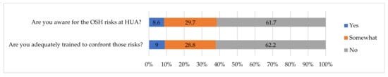 The next question was about surveyees’ OSH risks awareness (Figure 3). Regarding this question, 61.7% report that they are completely unaware, and around a third (29.75%) claim to be slightly aware, while just 8.6% answer that they are aware. A similar pattern appears when surveyees were asked if they have been trained to identify, prevent, and handle OSH-related potential risks that they may encounter. In particular, 62.2% say they were never trained, 28.8% claim to have been trained to a certain degree, while only 9% say that they have been adequately trained. This implies that respondents, even though they are strongly informed about the OSH procedures applied at HUA, are not very aware, and are only somewhat trained to confront those risks.
