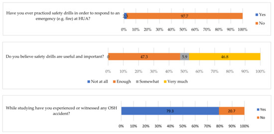 Surveyees were further asked about their experience in participation in safety drills in order to respond to an emergency, if they consider such training useful and important, and whether they experienced an accident either as victims or witnesses at HUA (Figure 4). The most common example is fire drills, in which a simulation or fire scenario is proposed, and participants are guided on how to respond to it. The majority (97.7%) of the respondents answer that they have never participated in any; however, a large percentage of respondents report they consider them very important (46.8%) or quite important (47.3%). These findings require the HUA principals to further insist on OSH procedures, in order for students, faculty members, and staff to be ready to tackle any safety challenge. Regarding the experience of an accident, 79.3% respond positively, which is a noteworthy finding with respect to accident reporting culture. Upon this finding, the HUA principals should sensitise students, faculty members, and staff to report all accidents or near-misses. Accident reporting is a procedure in which any accident is reported in order to assess corrective or preventive actions.