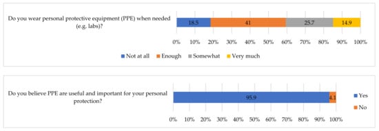 Surveyees were further asked if they wear PPE when needed (e.g., in labs) in order to avoid accidents and while they deemed them necessary for their personal protection (Figure 5). The results showed that the majority (95.9%) of respondents deemed PPE necessary, even though adherence to wearing them is still a problem. Only four out of ten (41%) use them frequently, a few just use them occasionally (14.9%), others rarely (25.7%), and some never (18.5%). This implies a need for continuous training and audits of proper use of PPEs when needed.