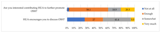 Furthermore, the surveyees were asked if HUA encourages discussion on OSH issues and whether they are interested to contribute HUA to further promote OSH (Figure 6). Interestingly, respondents’ replies suggest—albeit to differing levels—a high-level willingness (97.3%) to contribute to the HUA to further promote OSH; even though 26.1% of them answered that HUA does not encourage discussion of OSH issues.