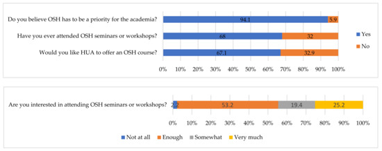 Finally, the surveyees were asked their opinion on whether OSH has to be a priority for academia, if they have ever attended OSH seminars or workshops, and whether they are interested in attending. Last but still important is if they would like HUA to offer them an OSH-related course (Figure 7). The majority (94.1%) of the respondents believe that OSH should be a high priority for academia. Towards this fact, findings of the current research also indicate the survey respondents’ strong interest—on different grounds and to a different degree—in attending seminars or workshops related to OSH (97.8%), despite the fact that nearly two out of three (68%) have already attended. Just as importantly, approximately two-thirds of the respondents (67.1%) indicated that they would like to be offered an OSH course.