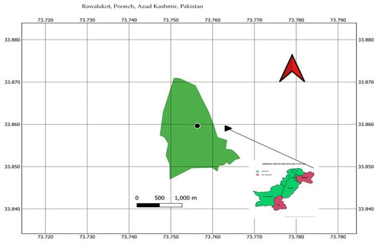 The map of the trial’s location (Rawalakot, Azad Jammu, and Kashmir, Pakistan) prepared using QGIST software whereby black doted place indicates the proximate location of the trial and half-arrow depicts North direction.