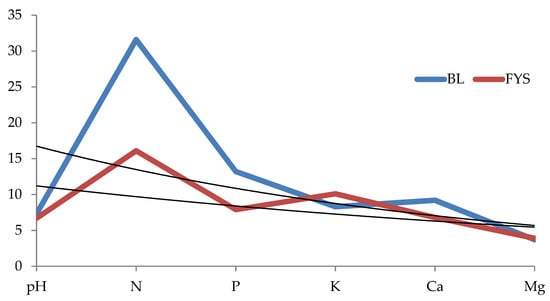Chemical composition regarding primary and secondary plant nutrients (mg kg−1) in organic manures (broiler litter BL, farm yard slurry FYS) ( data with exponential trend lines).