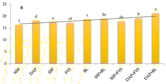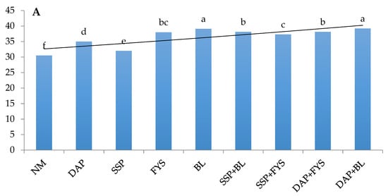 The results of our field trial depicted that organo-mineral fertilization regimes significantly influenced the harvest indices (HI) and seed oil content (SOC) of temperate soybean (Figure 4). The HIs ranged from 30–39%, whereby co-application of BL and DAP superpassed rest of treatments by recording the maximum HI of 39.2% (9% higher than control treatment) while sole application of BL performed statistically at par to it (Figure 4A). In addition, BL + SSP performed statistically equivalent to DAP + FYS by recording 5% greater HI compared to NM. Overall, BL remained superior to FYS while DAP performed better than SSP, however all integrated fertilization management systems statistically outperformed control treatment (NM). Pertaining to SOC, DAP + BL recorded significant superiority (31% higher than NM), while it was followed by combined application of DAP + FYS which recorded 11% lower and 17% higher SOC than DAP + BL and NM respectively (Figure 4B). To sum up, BL performed better with DAP and was trailed by SSP + BL and sole BL. Interestingly among solo manures, BL resulted in 3% higher SOC than DAP which in turn recorded 4% higher corresponding value in comparison to sole SSP.