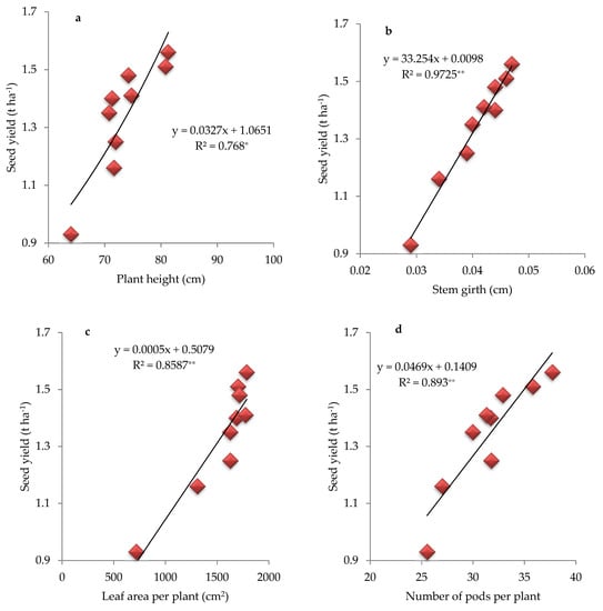 Correlation analyses depicting relationship between seed yield and yield attributes such as plant height (a), stem girth (b), leaf area per plant (c), number of pods per plant (d), and (e) 100-seeds weight of soybean. * = significant at p ≤ 0.05, ** = highly significant significant at p ≤ 0.05.