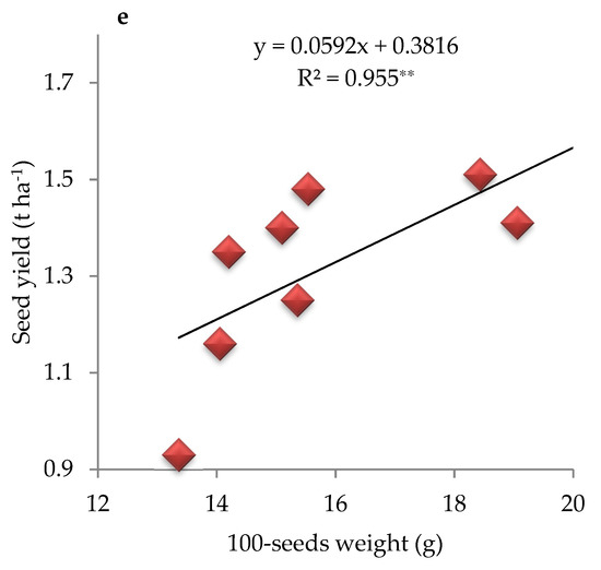 The correlation analyses among seed yield and yield attributes (both vegetative and reproductive) of temperate soybean under organo-mineral synergistic fertilization regimes are of vital pertinence owing to varying requirement of spreading and towering type cultivars. It indicated moderate degree of positive relationships (R2 = 0.76 *) between seed yield and plant height as the minimum plant height of 64 cm resulted in 0.93 tons ha−1 of seed yield, while 26% increment in plant height maximized the seed yield to the extent of 64% (Figure 5a). In addition, linear relationship of seed yield with stem girth (R2 = 0.97 **) was recorded whereby 23% enhancement in stem diameter yielded 48% higher productivity (Figure 5b). Likewise, leaf area also exhibited stronger direct association with seed yield of soybean (R2 = 0.85 **) whereby 1070 cm2 increment in leaf area boosted seed yield by 0.63 tons ha−1 that corresponds to over 65% increment in seed yield (Figure 5c). On similar fashion, reproductive traits of soybean including number of pods per plant recorded direct association (R2 = 0.89 **) with seed yield by improving it to the degree of 65% as the number of pods was increased from 25 to 37 (Figure 5d). Importantly, 100-seeds weight was strongly correlated (R2 = 0.95 **) with seed yield as the addition of 7 g weight in 100-seeds weight resulted in bolstering of seed yield by 0.63 tons ha−1 (Figure 5e). Interestingly, reproductive yield attributes (number of pods and 100-seeds weight) were more strongly associated with seed yield of soybean compared to vegetative growth traits like plant height.