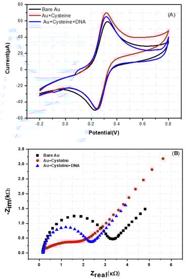 Figure 2A displays the working electrode cyclic voltammograms before and after the modification process. The change in the electroactivity aspect of the solid/liquid interface during the modification process demonstrates the adsorption of the different deposit layers. The deposit of the cysteine layer enhances the conductivity of the modified electrode due to the fast charge transfer established at the solid/liquid interface. The conductivity increases then decreases after the DNA layer deposition. This behavior can be attributed to the flexible DNA sequences that reduce the charge transfer process. This change in conductivity surface during modification was confirmed using impedance spectroscopy measurements.