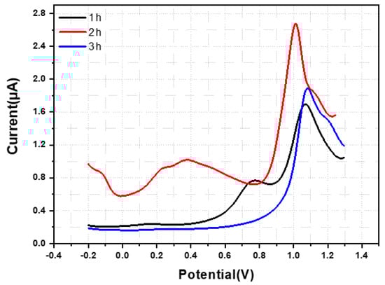 Figure 3 shows the electrochemical behavior based on the differential pulse voltammetry signal of the modified electrode by DNA in contact with the water samples for 1, 2, and 3 h. A significant effect induced by the different water samples on DNA activity was obtained during an exposure time of 2 h, which was selected as the optimal duration.
