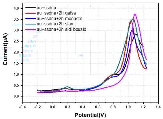 18]. Differential pulse voltammetry (DPV) measurements showed a significant effect of hospital effluents on the hybridization process of immobilized DNA, and the binding reaction and interaction between immobilized DNA and wastewater samples were achieved by dipping the biosensor into different test solutions for different times.