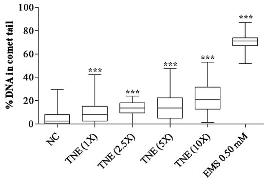 DAPI (fluorescent dye) was used to stain DNA, and slides were analyzed with an Axio Imager.Z2 (Zeiss) fluorescence microscope equipped with Metasystems’ Metacyte and Metafer 4 software (version 3.8.5) to quantify DNA damage (Altlussheim, Germany). Ethyl methanesulfonate (EMS) (0.5 mM) was used as a positive control, and an unexposed control cell was used as a negative control. For each concentration, two different gels were made with the analysis of 50 cells per gel. In addition, the percentage of comet tail DNA was used as a measure of DNA damage.