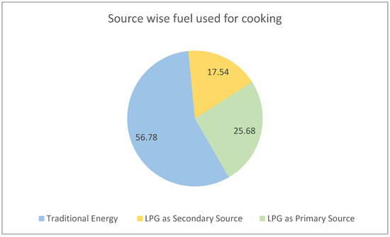 The districts are chosen for the study—namely, Koraput, Nabarangpur and Kandhamal of Odisha—are characterized by a high score in energy poverty [29], indicating lesser access to clean energy. Figure 1 presents the source of energy used for cooking among the sample households. The household data from the present study shows that nearly 57% of the respondents use traditional energy sources for cooking while the remaining 43% have adopted LPG. Out of the 43% of respondents who have adopted LPG, 17% use it as a secondary source and the other 26% use it as the primary source for cooking. Figure 2 presents the district-wise energy used for cooking as a percentage of different sources of energy among the sampled households. There is heterogeneity among the districts in LPG adoption. Nearly 65% of the households in the Koraput district use traditional sources of energy, 24% use LPG as the primary source of energy for cooking and 11% use it as the secondary source. Higher rates of LPG adoption are observed in the other two districts.