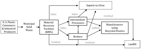 There is growing interest in integrating sustainability principles into supply chain management [19,20,21], particularly reverse supply chains. The reverse supply chain is the series of activities necessary to retrieve a product from a customer and either dispose of it or recover value [22,23,24]. For example, the reverse supply chain for plastics (as depicted in Figure 1) starts with individual consumers of plastic containers and packaging and industrial producers who place recyclables at the curbside for collection. Municipalities that collect these recyclable materials contract with MRFs to sort the recovered plastic and other recyclable materials and convert them into bales. The recovered plastic bales from the MRFs are then sent to intermediate plastic processors. The plastic bales are processed and converted into recyclable inputs, such as pellets and flakes, or directly to brokers who export the reclaimed material. In addition, manufacturers using recycled plastics in their branded products demand recyclable plastics [25]. The residuals, consisting of mixed plastic waste generated at MRFs, brokers, and processors, are typically landfilled.
