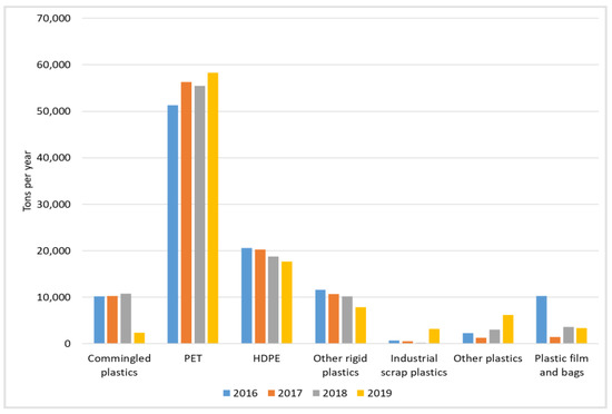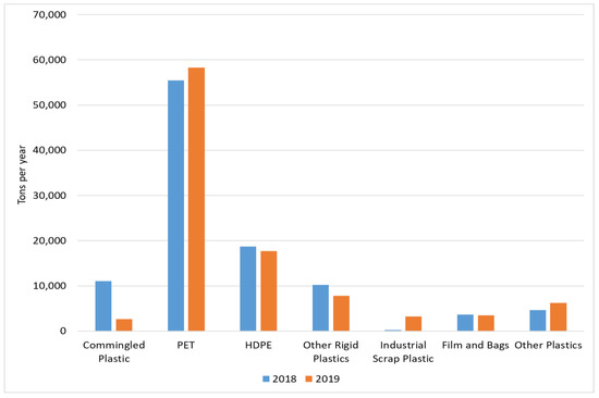 In light of the above analysis, a focused study of recycling and recovery efforts in New York, one of the country’s larger states, with relatively higher population and economic activity, is of added interest. In 2014, 37.0 million tons of waste were generated in NYS, representing a per capita annual generation of 1.9 tons [45]. To gauge how plastic recyclable materials recovery has been impacted since China’s National Sword Policy, the authors created a database of information obtained from annual reports submitted by registered MRFs in New York state provided by the state’s Department of Environmental Conservation. The annual reports are in portable document format (PDF) files, relevant parts of which we transcribed to an Excel workbook. These forms contain data about how plastic is collected and recovered by the MRFs. Our database includes this information for the years from 2016 to 2019 inclusive.