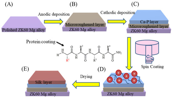 Figure 1. Schematic diagram of the layer-by-layer coatings (not to scale) fabrication on ZK60 Mg alloy. (A) bare, (B) anodized, (C) HA coated, and (D,E) SF + HA coated ZK60 Mg alloy specimens.