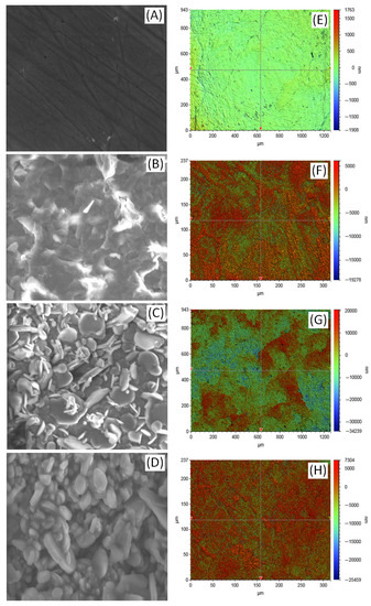SEM micrograph (50 µm frame length) of (A) bare, (B) anodized, (C) HA coated, and (D) SF + HA coated ZK60 Mg alloy specimens. 2D surface roughness micrograph of (E) bare, (F) anodized, (G) HA coated, and (H) SF + HA coated ZK60 Mg alloy specimens.