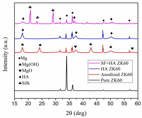 Figure 3 shows the XRD spectrums of bare, anodized, HA coated, and SF + HA coated ZK60 Mg alloy samples. The observed XRD peaks at 2θ values 31.9, 33.6 and 36.3 degree corresponds to Mg, which is in good agreement with values reported in the literature for ZK60 [27]. The XRD peaks observed at 2θ values 17.68, 23.91, 37.98 and 43.45 correspond to the Mg(OH)2, whereas 48.55 and 58.48 correspond to MgO, respectively. Mg(OH)2 and MgO films are stable layers that can resist the fluid permeation in the surface resulting in improved corrosion and degradation resistance [9]. On the other hand, the XRD peaks observed at 2θ values of 17.5, 38.1, 49.2 and 51.9 degree for HA coated ZK60 sample correspond to the Miller indices (110), (212), (213) and (402) of the inorganic HA phase [11]. Moreover, the (211) plane of both ZK60 and HA overlap/co-incident at 2θ value 31.9 degree [11]. The crystalline HA coating with robust binding force could reduce the corrosion and degradation rate of ZK60, and also improve the surface mechanical properties of ZK60, further extending its stability as an implant material [28,29]. The additional XRD peaks observed at 2θ values 27.9, 23.8 and 20.7 degree for SF + HA coated ZK60 sample corresponds to the silk I, silk II and random coil structural conformations of SF protein, respectively [30]. The observed stable structure of mixed phases of SF + HA coating could potentially tune the surface properties of ZK60 and increase its corrosion and degradation resistance properties.