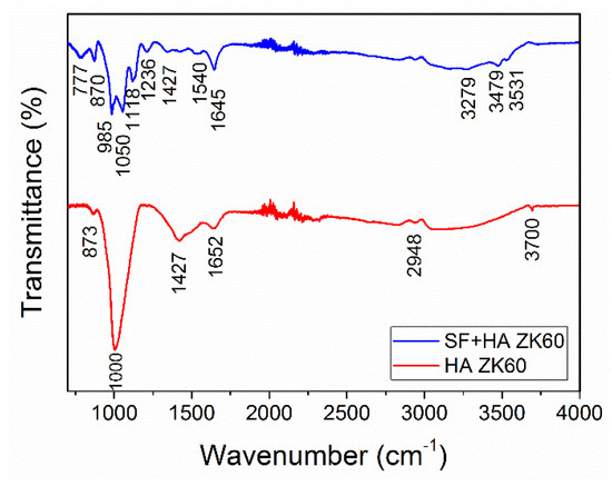 FTIR pattern of the HA, and SF + HA coatings on ZK60 Mg alloy.