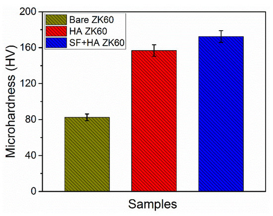 Microhardness is an important surface mechanical property commonly used to assess the quality and functional effectiveness of coatings for bio-implants. The measured microhardness values of fabricated samples are provided in Figure 5. The bare ZK60 sample exhibited an average Vickers hardness value of 82.5 ± 3.78, which showed a 90% increase with anodization and successive HA coating. A further 19% increase in Vickers hardness value was measured with the final SF coating, which offers adequate resistance to the external forces on the substrate. In contrast, the adhesion strength is an essential parameter in considering the mechanical integrity of the coatings in implant applications. The HA and SF + HA coated ZK60 Mg alloy substrates exhibited an adhesion strength of 21.65 ± 0.85 and 26.32 ± 0.91 N/mm2, respectively. The adhesion strength of the HA coating is greatly dominated by the surface microroughness of the ZK60 substrate created by anodization; where, the HA crystals formed in the surface pores provide an anchoring effect for the HA layer. In addition, the SF coating further effectively increases the adhesion strength due to strong chemical interactions (interfacial bonding) between HA and SF [33,34]. The SF + HA hybrid coating effectively improves the mechanical integrity among other substrates to ensure the implant stability for long-term service. Therefore, the fabricated hybrid coating is anticipated to significantly improve the corrosion and degradation resistance properties of ZK60.