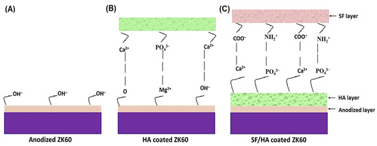 Schematic diagram of adhesion mechanism of engineered layers: (A) Anodized layer, (B) HA coating and (C) SF + HA coating layer on ZK60 Mg alloy.
