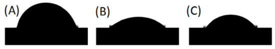 Contact angle images of water droplets on (A) bare, (B) HA coated, and (C) SF + HA coated ZK60 Mg alloy samples.