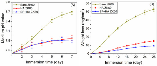 The in vivo performance and longevity of bio-implants is largely influenced by their stability in biological fluids at physiological pH and osmotic pressure. In aqueous solutions, Mg and its alloys generate H2 gas and Mg2+ ions, which leads to an increase in the pH of the solution [34,39]. To study the stability or degradability of bare, HA, and SF + HA layer on ZK60 Mg alloy specimens in simulated body fluids, the fabricated samples were immersed in the solution of Hank’s balanced salt (maintained at 37 ± 0.5 °C), and their weight and solution pH was measured periodically over a period of 28 days. With an increase in time, the pH of the solution was observed to increase for all samples (Figure 8A); where, higher pH denotes higher dissolution of Mg2+. The solution with bare ZK60 showed a rapid increase in pH for the first 5 days, which indicates rapid dissolution of Mg2+, followed by a slightly decreased rate of pH change. With HA coating, the overall dissolution rate of Mg2+ was observed to decrease, which indicates the effectiveness of the HA layer as a barrier to rapid degradation of the sample. Moreover, the pH of the solution containing SF + HA coated ZK60 sample was measured to be stabilized after 5 days of immersion, suggesting relatively improved protection to degradation with SF coating. Figure 8B shows the weight loss result of tested substrates in Hank’s solution. The bare ZK60 sample exhibited rapid weight loss at the first two weeks of immersion (as compared to other samples), followed by decreased weight loss rate in the next two weeks; which may be linked to the formation of Ca3Mg3(PO4)4 precipitates on samples (where Ca2+ and PO43− ions in the Hanks’ solution can react with Mg2+ ions released from the substrate), thereby acting as a protecting layer [40]. The rate of weight loss was observed to significantly decrease with HA coating, which shows the effectiveness of the HA layer as a barrier to rapid degradation of the sample. Moreover, subsequent SF coating further decreased the weight loss of the substrate; where, the SF + HA coated ZK60 sample showed almost 6 times lower weight loss associated to the bare ZK60 sample. The weight loss performance of all samples is also in good agreement with the trend observed for solution pH change. Therefore, the SF + HA hybrid coating offers adequate obstruction to penetrate fluid into the main substrate surface, thereby increasing the stability of the sample in simulated body fluids.