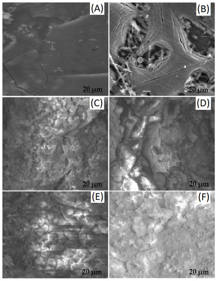 Figure 9 shows the surface morphology of degraded samples after immersion in Hanks’ solution for 14 and 28 days. After immersion for 14 days, the bare ZK60 sample showed some cracks, pits and degradation products on the surface (Figure 9A), which significantly spread and deepened after 28 days of dipping (Figure 9B), which is also consistent with literature reports [41]. In contrast, the HA coated ZK60 sample showed a homogeneous surface coating with no cracks observed for 14 days (Figure 9C). However, the appearance of some new cracks was observed after 28 days of immersion (Figure 9D), which shows decrease in integrity of the coating over time. On the contrary, the SF + HA coated ZK60 sample showed a homogeneous surface with no cracks or damage observed after 14 and 28 days immersion (Figure 9E,F), which establishes the effective protection of SF against degradation among tested samples. Therefore, the fabricated SF + HA hybrid coating is anticipated to provide superior corrosion resistance properties.