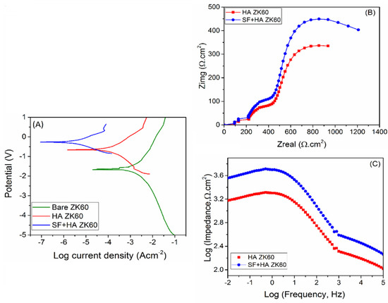 The corrosion resistance performance of the coatings was studied using PDP and EIS measurements. Figure 10A shows the PDP curves of fabricated samples; where, the nobler direction of the potential represents higher corrosion resistance. The electrochemical behavior of bare ZK60 shows typical to that of active metal corrosion. The corrosion potential (Ecorr) and corrosion current density (Icorr) values obtained from PDP curves, and the calculated corrosion rate (CR) is given in Table 2. The bare ZK60 sample exhibited an Ecorr value of −1.58 V, which increased to −0.64 V with HA coating, and further to −0.25 V with subsequent SF coating [11]. This indicates a reduction in the thermodynamic tendency of ZK60 onto electrochemical corrosion with each successive coating [42]. With HA coating, the ZK60 exhibited about 78.1 times lower CR, whereas 195.2 times with SF + HA coating. Moreover, the protection efficiency (PE) of HA coating on ZK60 was calculated as 98.8%, which further increased to 99.46% with subsequent SF coating. Thus, the SF + HA hybrid coating effectively reduces ZK60 corrosion kinetics by more than two orders of magnitude, and the observed trend in corrosion resistance is in good agreement with the degradation results (pH change and weight loss).