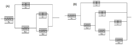 Figure 10B,C show the Nyquist and Bode plots of fabricated samples, respectively, obtained from EIS measurements. The Nyquist plot (Figure 10B) of SF + HA coated ZK60 sample showed a larger capacitive loop in comparison with HA coated ZK60 specimen, which pointed toward greater corrosion resistance properties of the hybrid coating compared to just HA layer. The Bode impedance plot also displayed greater impedance values for SF + HA coated ZK60 sample supporting its higher corrosion resistance properties when compared to the HA coated ZK60 sample (Figure 10C) [43]. These results reveal that the SF coating efficiently acts as a supplementary barrier film, thereby further improving the corrosion resistance of HA coated ZK60 sample in Hanks’ solution [44]. Similar observation was made by Choudhury et al. [45] in their studies on sol–gel derived hybrid coatings containing three different compositions of methacrylate-phosphosilicate (M:E) on mild steel substrates (MS) as characterized using various electrochemical including potentiodynamic polarization studies. MS sample exhibited the lowest Ecorr (−0.72 V) whereas the highest Ecorr (−0.16 V) was recorded for M:E—3:7 samples. The Ecorr of the M:E—1:1 samples shift positively as high as 250 mV respectively. The shifting of the Ecorr values of all the coated samples to the noble direction in comparison to the bare MS sample indicates the enhanced corrosion resistance due to the inhibition of the anodic reaction. The efficient corrosion protection of the hybrid coatings has been ascribed to the strong interfacial interaction with the substrate and their effective barrier characteristics. In the present case, to obtain in-depth information of the contribution of each layer to corrosion resistance, impedance data was further analyzed by fitting the data to equivalent circuit models (Figure 11), which represents respective physical model of each sample.