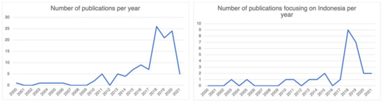 Number of total publications screened and number of publications focusing on Indonesia per year.