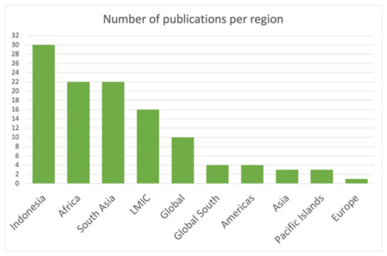 The search found 30 publications that focused specifically on Indonesia (of which four were the situation reports from UNICEF that provided updates on the tsunami situation). Given this paucity of literature, the search included literature from other countries and regions. The most common region found in the literature was Africa as a region or an African country and South Asia, with 22 publications. It is worth noting that half of the publications pertaining to South Asia were located in India (11 publications). The second most common geographical category was low- and middle-income countries (LMICs) with 16 publications, including publications that focused on three or more countries in this region. The remaining publications, including publications that covered entire continents or a single country, were grouped geographically, as shown in Figure 3.