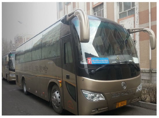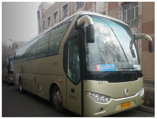The vehicles used were all commuter buses, containing 39 (Figure 1) or 49 (Figure 2) seats, and the driver’s seat was on the left-hand side. The length of the bus was 8995 mm or 10,990 mm, with a width of 2500 mm and a height of 3360 mm or 3440 mm.