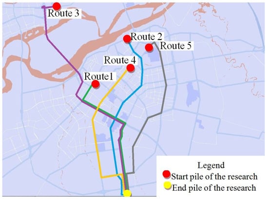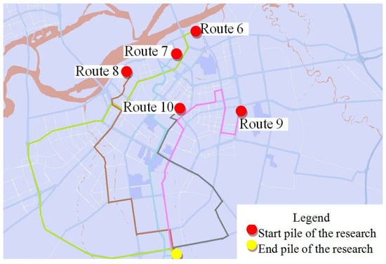 As shown in Figure 3 and Figure 4, the roads were urban roads, comprising ten routes containing 84 stations. The total distance of the ten urban roads was approximately 180.4 km in Harbin, China. The ten roads comprised two or three lanes in each direction, and the speed limit on the varied from 50 to 60 km/h. The ten routes were the same for working or weekend days and good or bad weather. This condition allowed for evaluating the effects of speed and vehicle clearance.