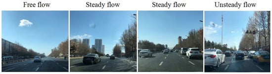 The traffic environmental conditions were described by traffic flow states and divided into four grades according to saturation [26,27] (see Table 1). The driver freely selects the driving speed in Grade I (free flow) but is limited to a certain degree when the traffic environment saturation is Grade II (intermediate range of steady flow). If the driver is in Grade III (lower half of steady flow), the driving speed is limited substantially; whereas the driver has no freedom to select the driving speed in Grade IV (unsteady flow). Figure 5 shows real-life traffic flow states.