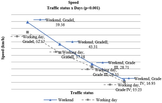 The analysis revealed that, except for Grade III and Grade IV, the average speed on urban roads was significantly different for the two traffic scenarios (working days and weekends), with an average speed that was higher for weekends than for working days. For both days, the traffic status with Grade IV significantly resulted in the lowest average speed. In Grade III and Grade IV, the difference in the average speed of the commuter buses between working days and weekends was not significant.