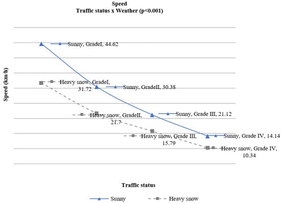 Because the interaction effect was significant, this was used to interpret the results. The average speed for all combinations of “traffic status” (Grades I–IV) and “weather” is presented in Figure 8. Moreover, Table 4 provides a detailed examination. Similarly, we considered a significance level of 0.002 for pair-wise comparisons.